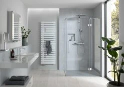 Auf Wunsch ist die Verglasung mit einer Edelglas-Beschichtung möglich. Diese einseitig aufgetragene Beschichtung minimiert das Antrocknen von Wassertropfen und das Festsetzen von Schmutz und Kalk. Die Reinigung der Verglasung wird damit erleichtert – allerdings nicht erspart.