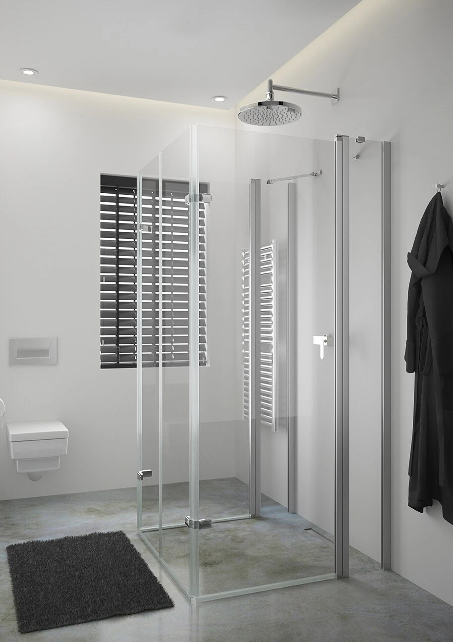 - zwei teilgerahmte Schwingfalttüren als Glastürflügel mit zwei festen Segmenten zum Einbau als U-Kabine