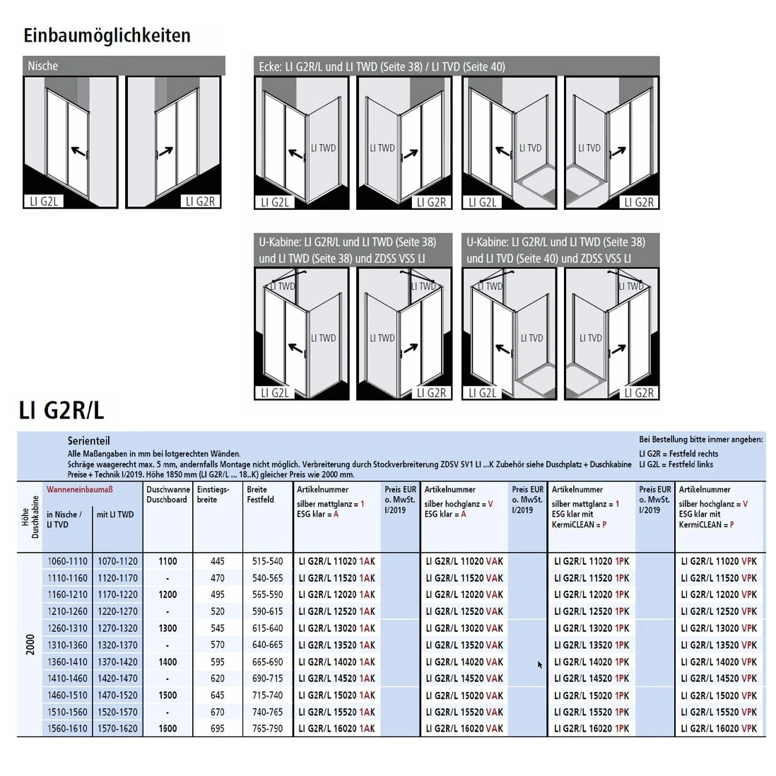Kermi Liga Gleittür 2-teilig 135 cm mit Festfeld links 3