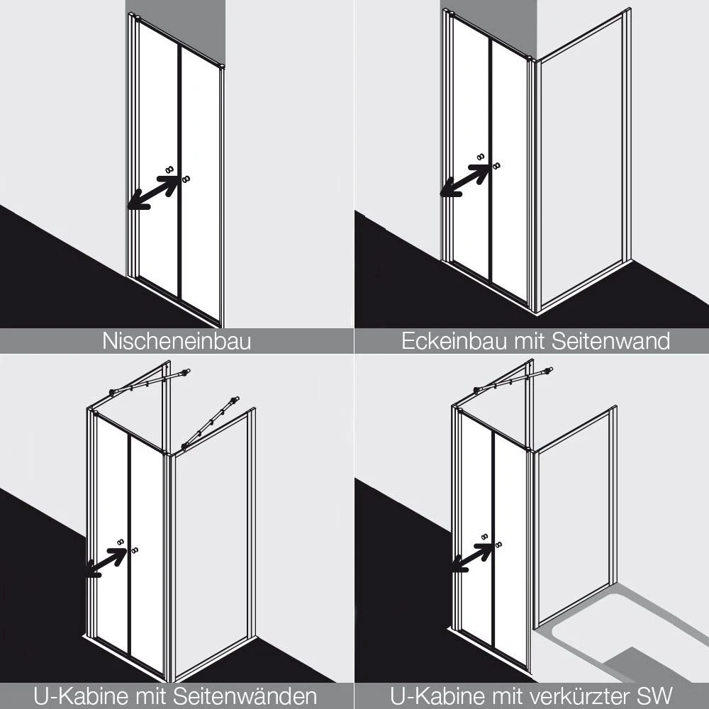 - Zur Kombination mit Seitenwänden als U-Kabine, muss die Pendeltür als Sondermaß bestellt werden!