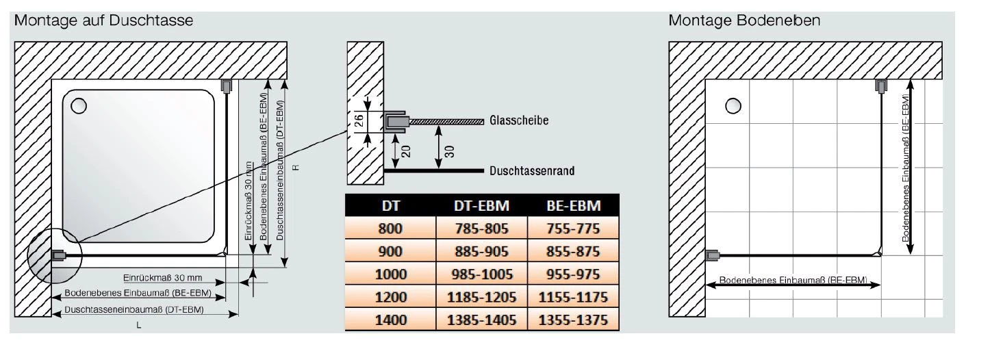 Das Duschwannen-Einbaumaß ist das Maß, das die Duschwanne nach ihrem Einbau haben muss, damit die Duschabtrennung passend, d.h. inklusive der empfohlenen Einrückmaße, montiert werden kann.
